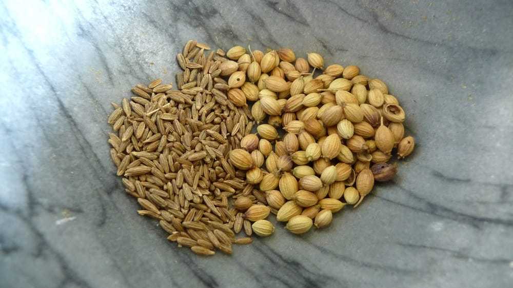Получившиеся кусочки говяжьего сердца присыпать 1/2 ч.л. молотой зиры, 1/2 ч.л. молотого кориандра и солью. Хорошо перемешать.