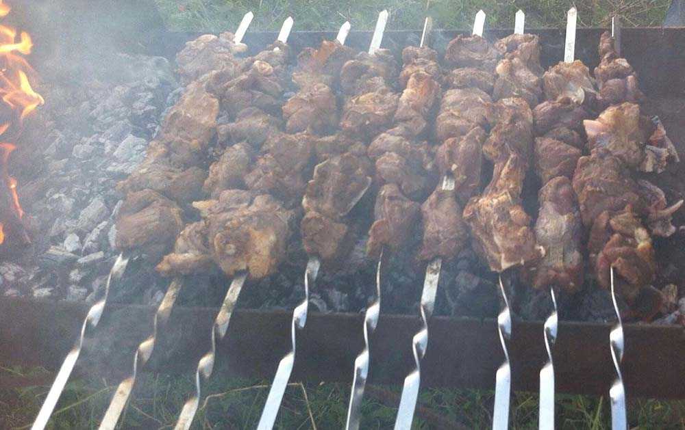 Для любителей дикого мяса подойдет шашлык из кабана. На углях он готовится примерно столько же времени, сколько свинина. Главное не брать большие куски, иначе мясо не успеет приготовиться.