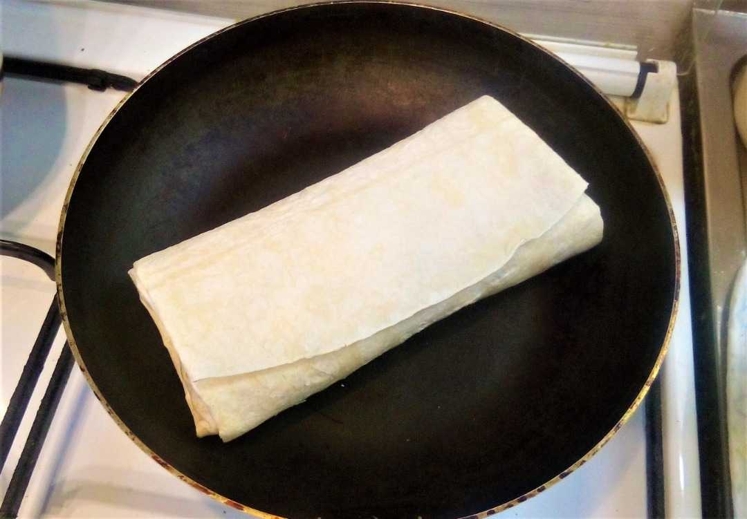 Шаг 5: Подготовка лаваша. Нагрейте лаваш в микроволновке или на сковороде. Лаваш должен стать мягким, чтобы было удобно его скручивать.