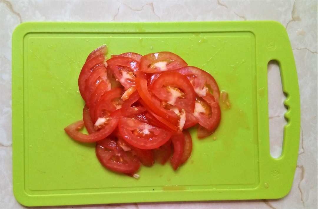 - Порежьте лук и перец тонкими полосками, а помидоры – кубиками.