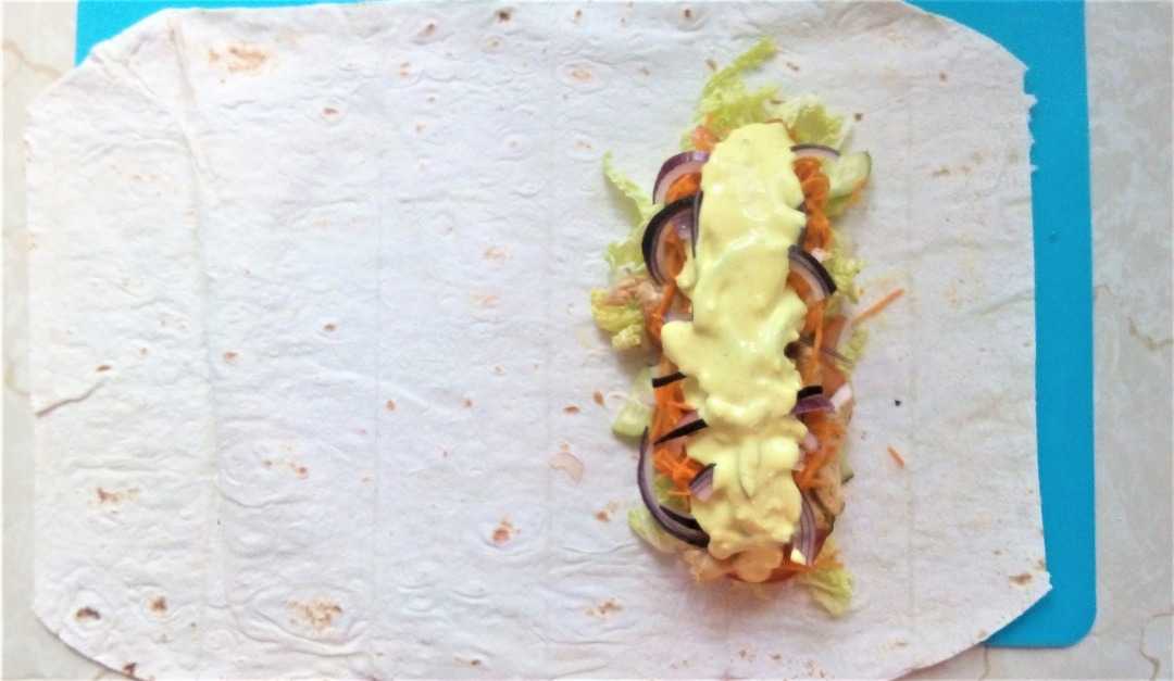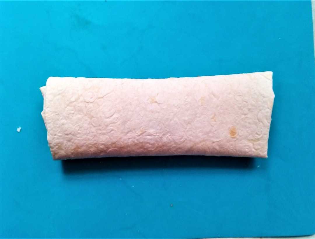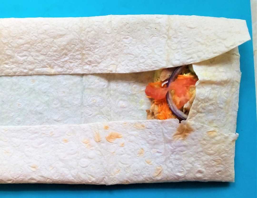 - Сверните лаваш или тонкую тортилью в форму рулета, закрывая начинку.