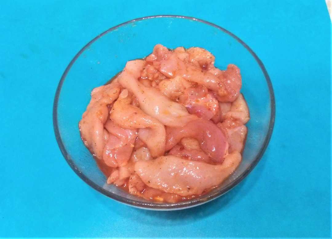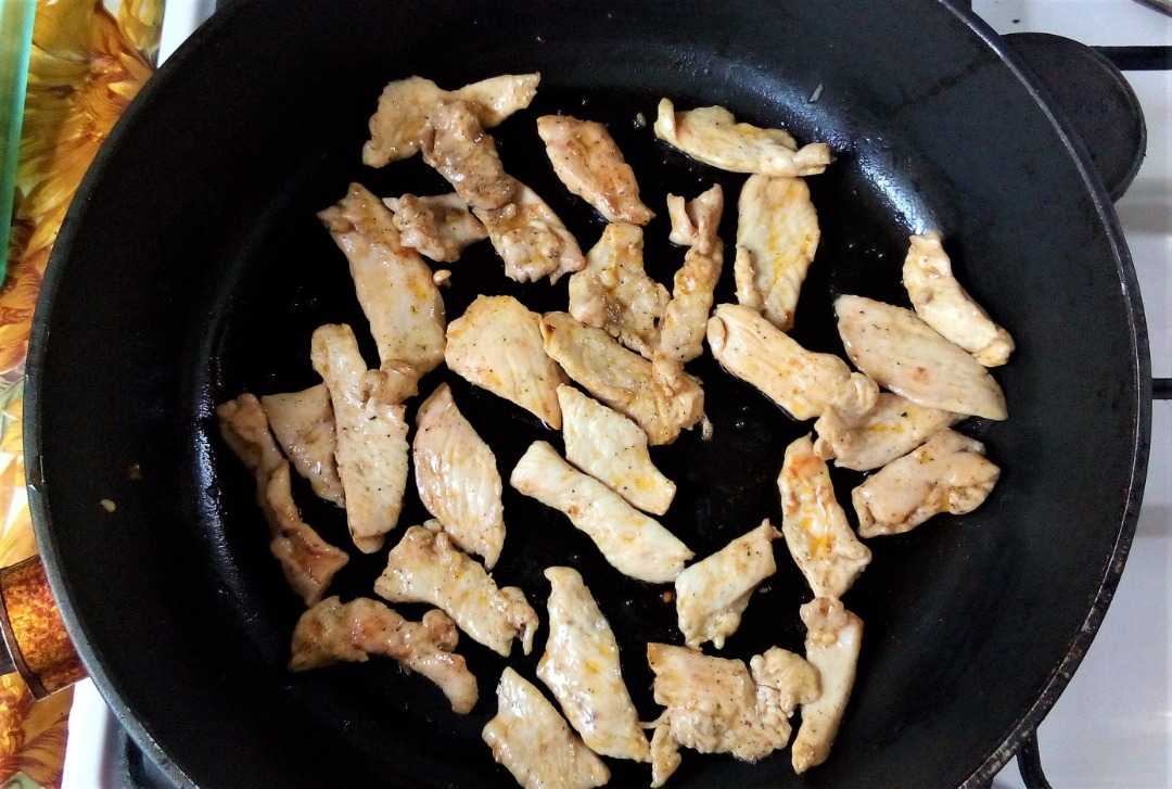 Курица промариновалась — время её приготовить. Обжаривать курицу лучше на сухой сковороде-гриль (но можно использовать обычную антипригарную с небольшим количеством масла). Поставим ее на средний огонь и готовим курицу в течение 5 минут, часто переворачивая. Курица у нас нарезана очень тонко, поэтому обжаривается она очень быстро.