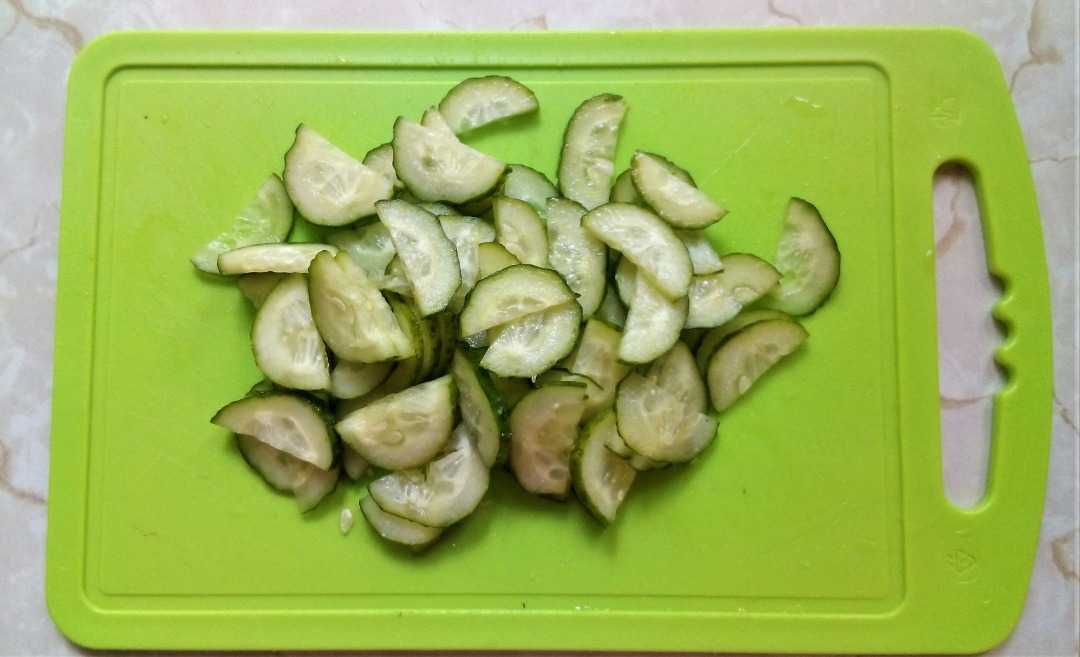 Шаг 3: Приготовление овощей. Огурцы, помидоры и капусту следует нарезать тонкими полосками или кубиками. Лук можно нарезать полукольцами или тонкой соломкой, предварительно замариновав его в уксусе или лимонном соке.