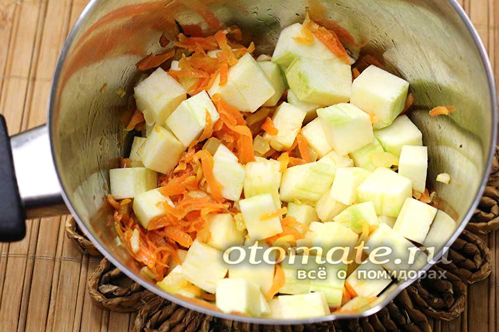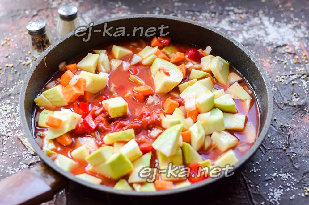 Выкладываем кабачки, смешивая с пассированными овощами. Прогреваем пока кабачки не начнут размягчаться.