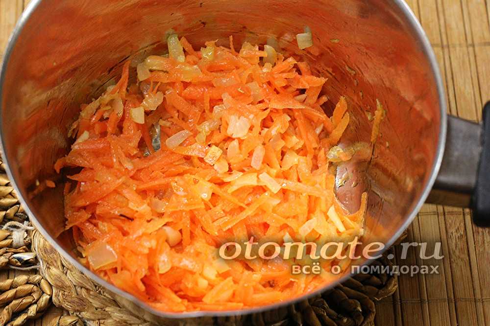 Добавляем тертую морковь, смешиваем с луком. Чтобы овощи не пригорали, уменьшаем нагрев до слабого. Тушим морковь с луком пять минут, напитывая маслом.