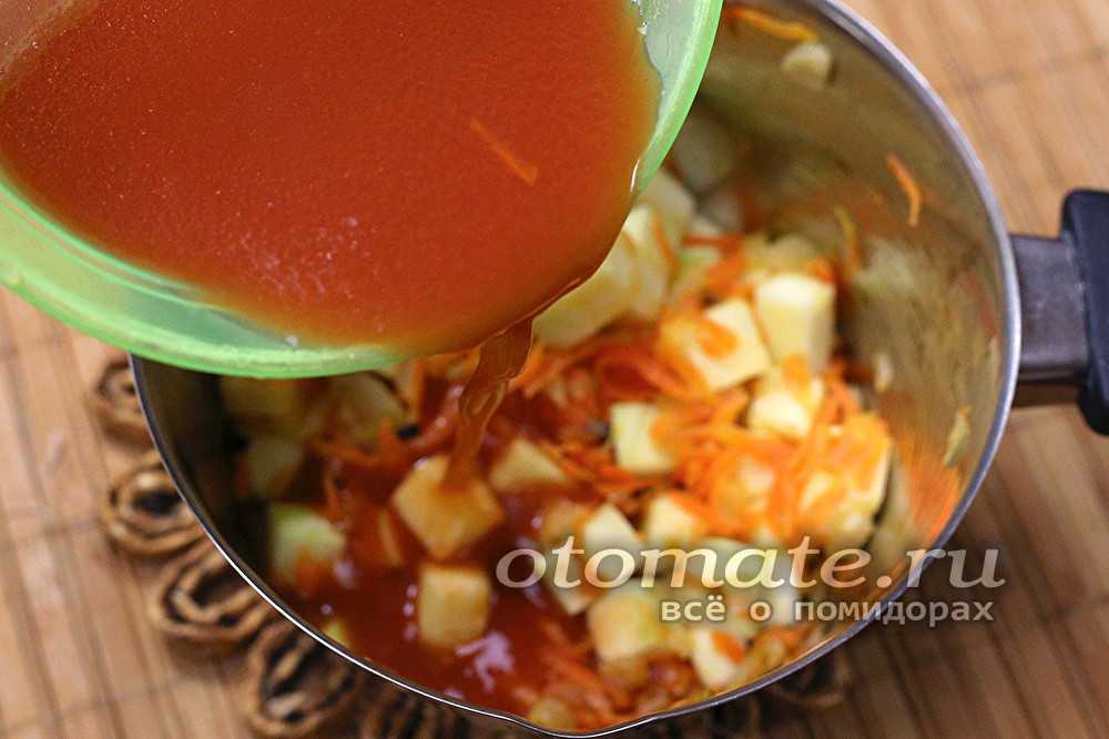 - Положите к луку и моркови томаты, тушите, пока не выделится сок.