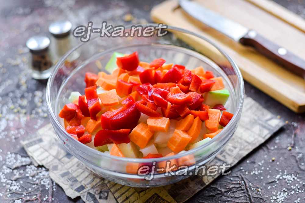 - Обжарить в масле продукты, закладывая их в сковороду в такой последовательности: кабачки, перец, лук, морковь.