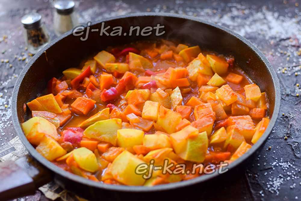 Добавить на сковороду томатное пюре, перемешать, убавить огонь и накрыть крышкой. Тушить овощи 10-15 минут.