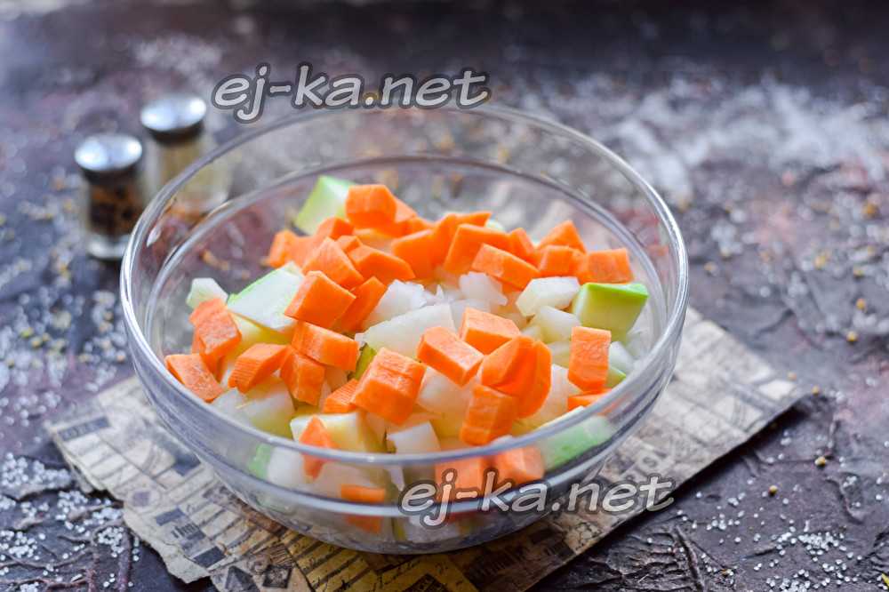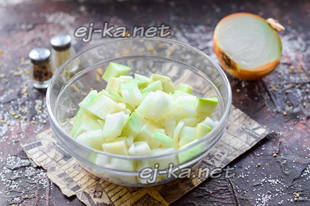 Очистить кабачок от кожуры и нарезать кубиками среднего размера.