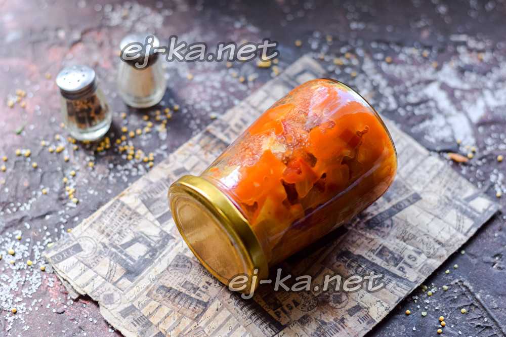 10. Как только прошло положенное время вынимаем банку и добавляем к соте сахар и уксус. Герметично закрываем крышкой и укладываем её на бочок. Таким образом мы перемешаем все специи и убедимся в том, что ничего не протекает.