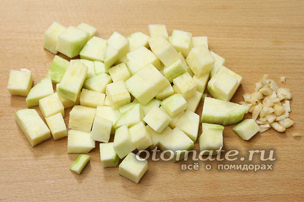 С кабачков срезаем кожицу. Режем небольшими кубиками как для рагу. Чесночные зубцы мелко рубим ножом.