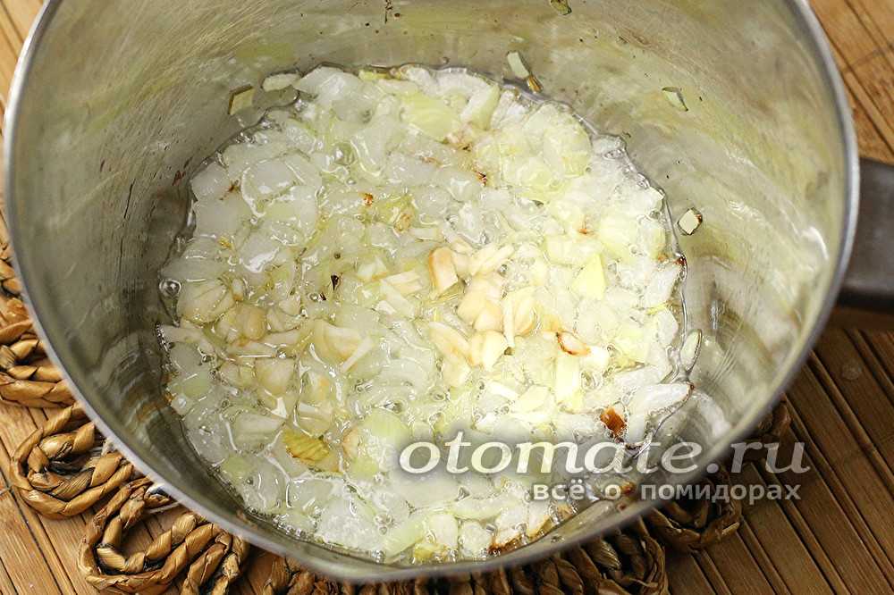 В сотейнике раскаляем масло, высыпаем лук. Помешивая, пассеруем на средне-сильном огне до появления золотистого оттенка на краешках. Когда лук только начнет подрумяниваться, высыпаем чеснок и сразу перемешиваем, следим, чтобы чеснок не сгорел.