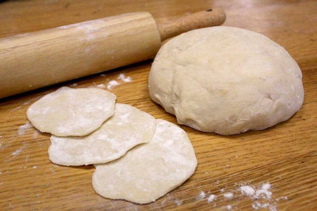 При раскатке теста и лепке изделий необходимо посыпать скалку и разделочную доску мукой, небольшим количеством.
