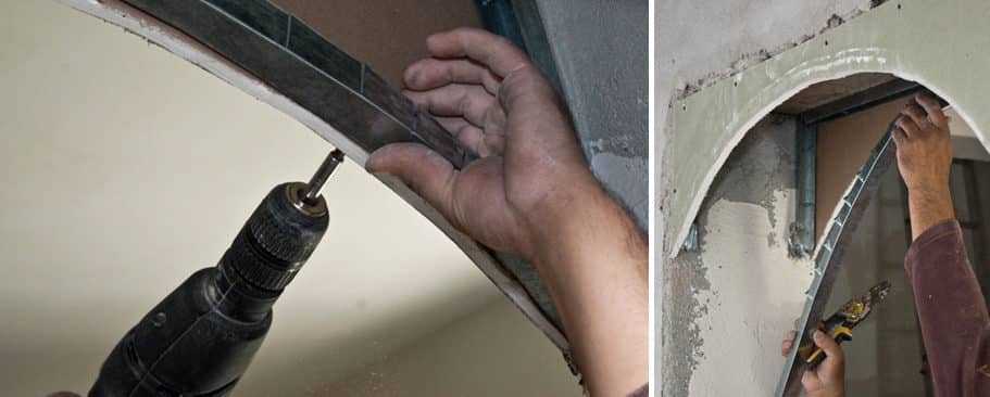 Монтаж фигурного каркаса – финальный этап. По внутреннему краю гипсокартонного листа необходимо установить направляющую. Для этого ее ребра надрезают до основания с расстоянием в 50–80 мм, чтобы она хорошо изгибалась в разные стороны. Проделываются V-образные вырезы для легкого сгибания профиля внутрь.