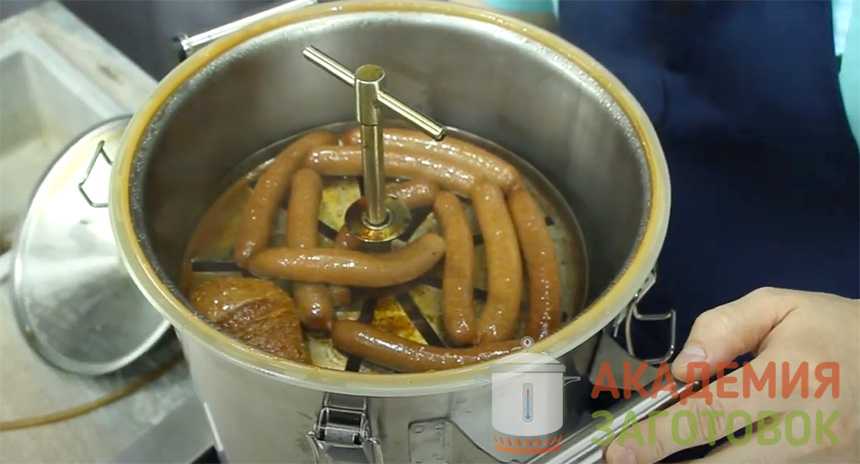 - Колбасы должны коптиться около 2 часов горячим методом. Первым признаком готовности является корочка коричневого цвета. После ее появления колбаски следует положить в кастрюлю с водой и поварить еще около часа. За это время жир окончательно вытопится и пропитает нежное мясо по всему объему. Остывшую колбасу подают на стол в качестве закуски.