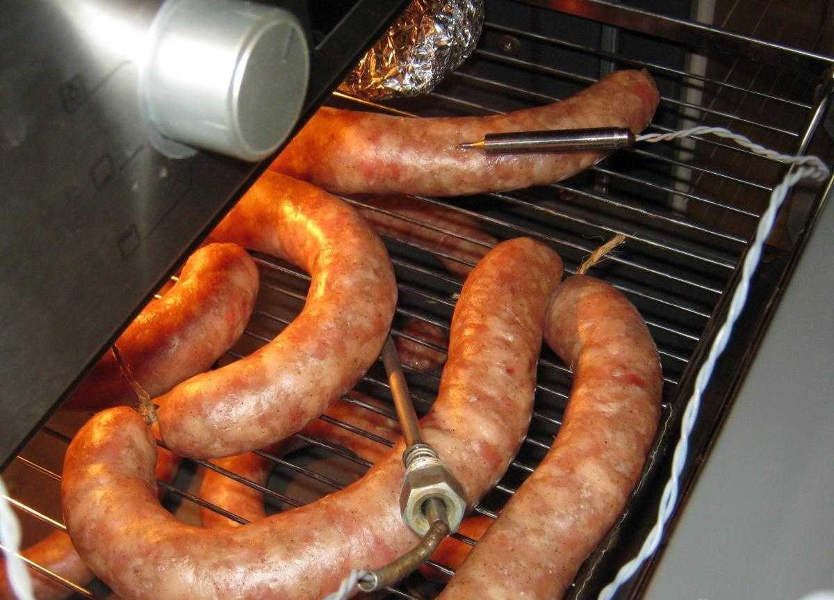 В течение трех часов температура духовки поднимается до 75-80 градусов. Вынимать деликатес надо, когда термодатчик покажет 69-70 градусов внутри. Батоны остужаются с помощью холодного душа и вытираются от влаги. Затем их подвешивают на 10 часов в прохладном помещении. Еще неделю она сохнет при температуре 15-20 градусов. Когда продукт приготовится, его надо положить в холодильник.