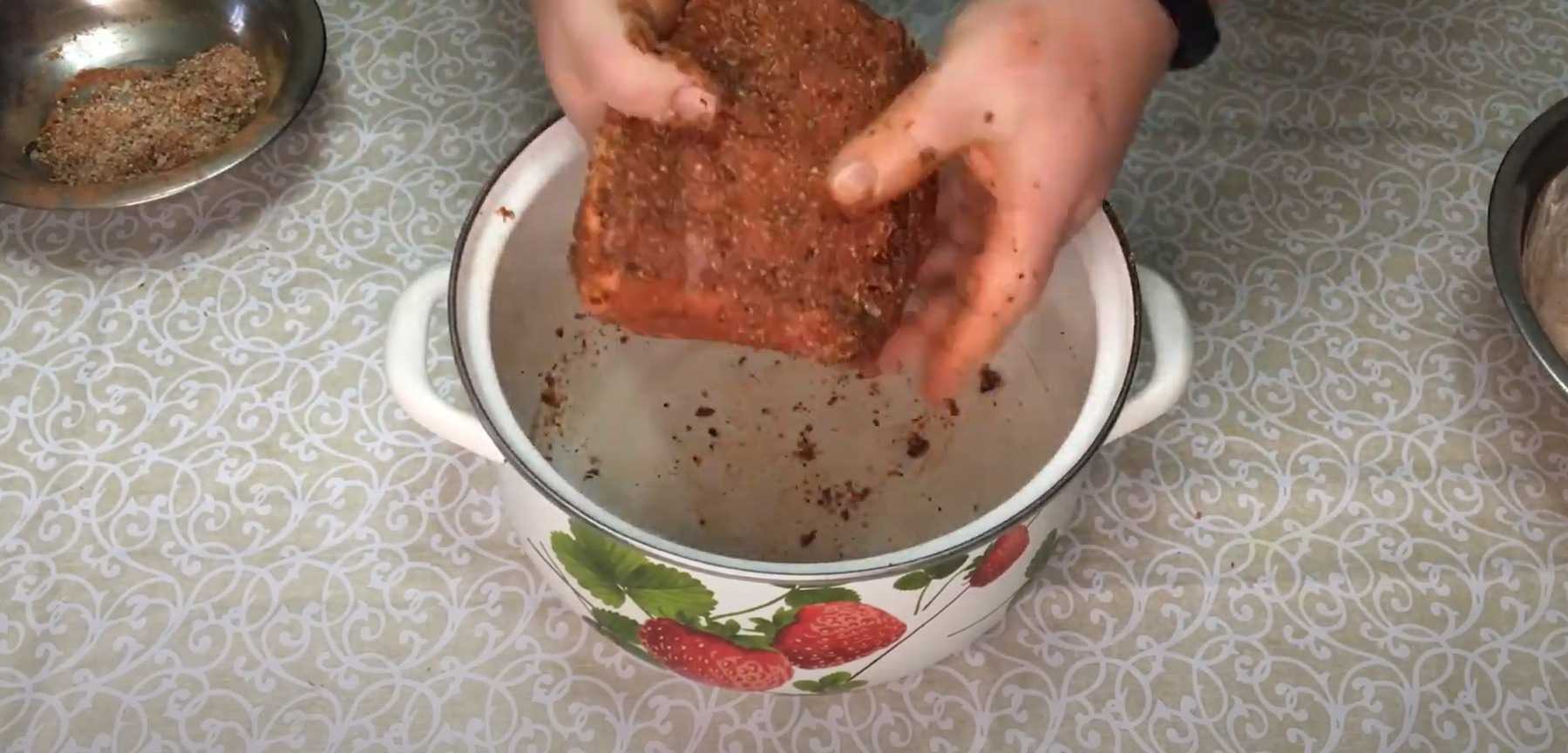 2. Взвесить свинину для расчета соли. Смешать все специи с солью. В кастрюле натереть свинину со всех сторон смесью специй. Убрать в холодильник на 2 суток.