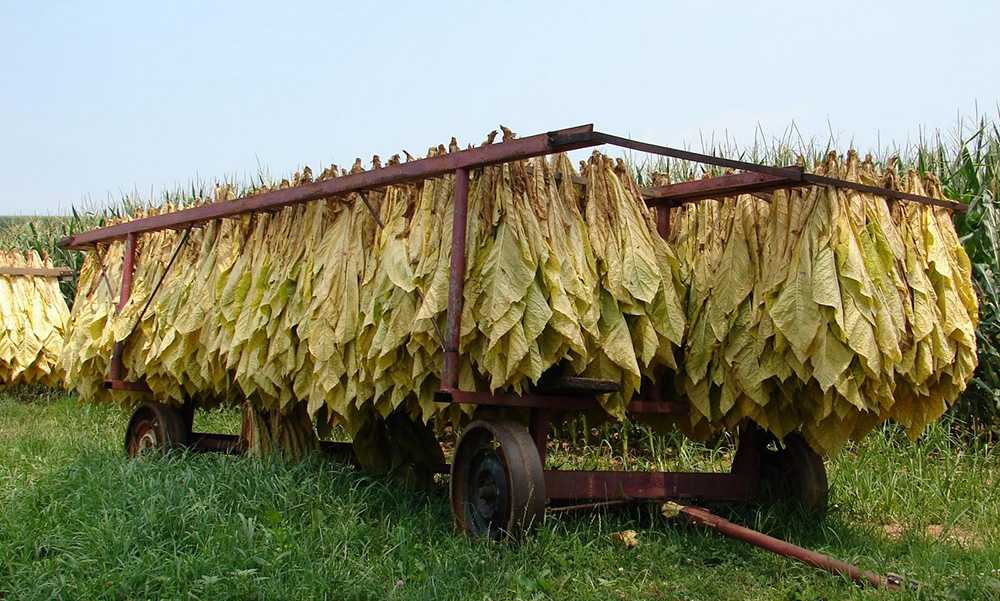 • Первую волну урожая табака убирают уже через полтора месяца после высадки рассады в открытый грунт. О готовности листьев свидетельствует небольшое пожелтение листочков, их слегка глянцевитый вид и сглаживание бугорков.