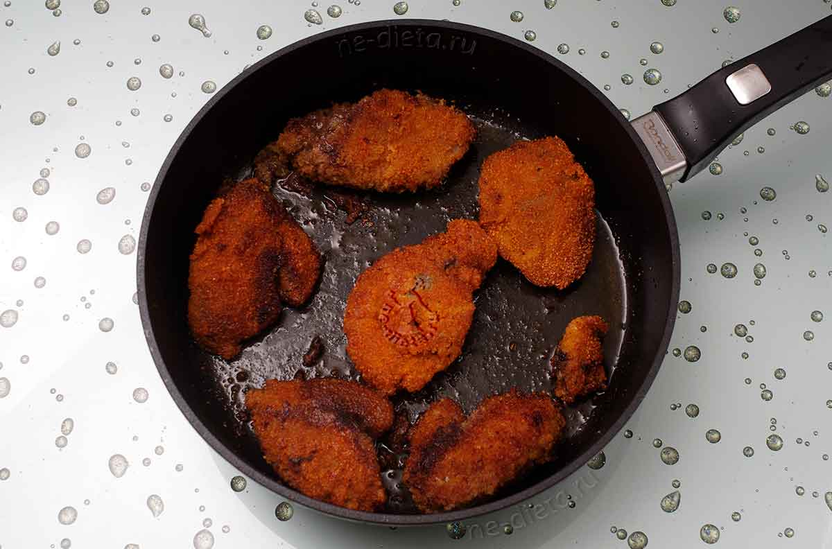Совет!Лучше не высыпать сразу все сухари на тарелку, а добавлять их понемногу примерно столько, сколько требуется на каждую отдельную печенку. Дело в том, что после панировки печени на тарелке остаются влажные комки, которые не дают получить аккуратное ровное покрытие, поэтому их надо удалять и только после этого подсыпать очередную порцию свежих сухарей. Кстати говоря, я предпочитаю использовать для приготовления этого блюда оранжевые панировочные сухари, поскольку они придают жизнерадостный и аппетитный цвет довольно мрачной на вид печени индейки.
