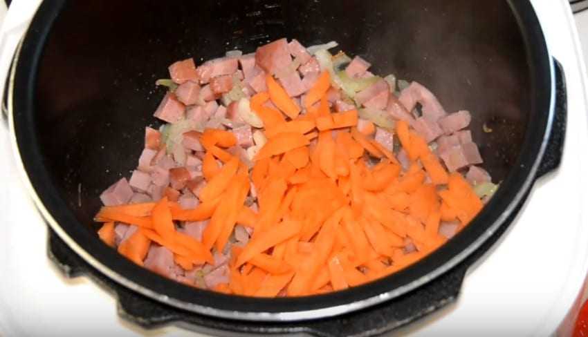 Обжаренный лук и морковку, отварную или консервированную фасоль, колбасу выложить в кастрюлю или салатник.