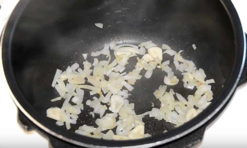 - Лук и чеснок почистите и мелко порежьте. Обжарьте их на растительном масле до полной готовности.