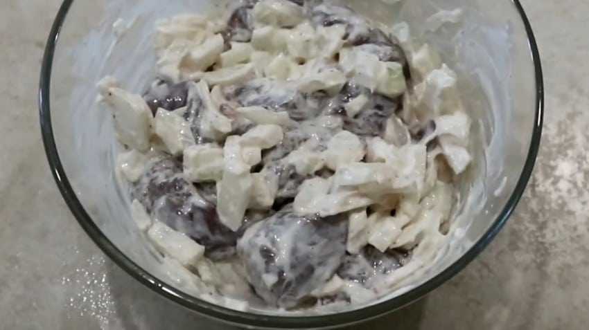 2. Добавьте измельченный лук, посолите, поперчите по вкусу, заправьте сметаной и хорошенько перемешайте. Оставьте промариноваться на 10 минут.