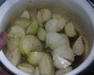 Теперь лук нужно замочить в растительном масле. Просто возьмите миску в которой это будем делать и хорошенько вымочите четвертинки лука. Делать это нужно без всяких специй, а при желании