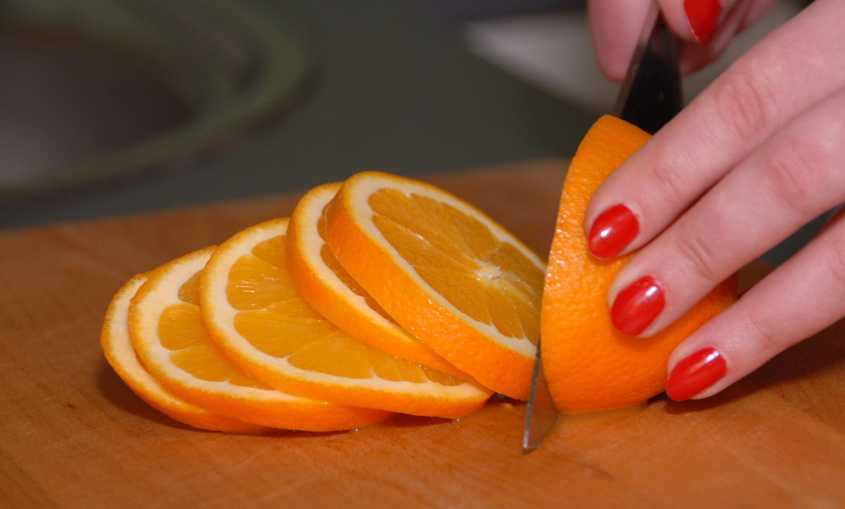 - Затем апельсины нужно нарезать на тонкие кружочки, примерно 0,5 сантиметра толщиной.