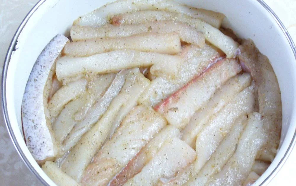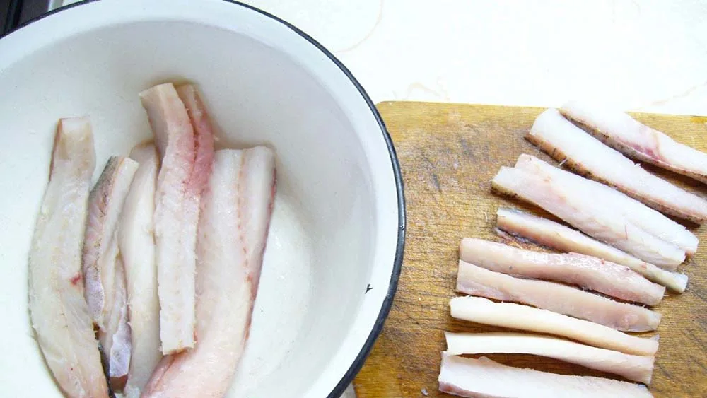 Тушки минтая предварительно размораживают и разделывают на филе, после чего мясо нарезают на полоски или брусочки одинакового размера.