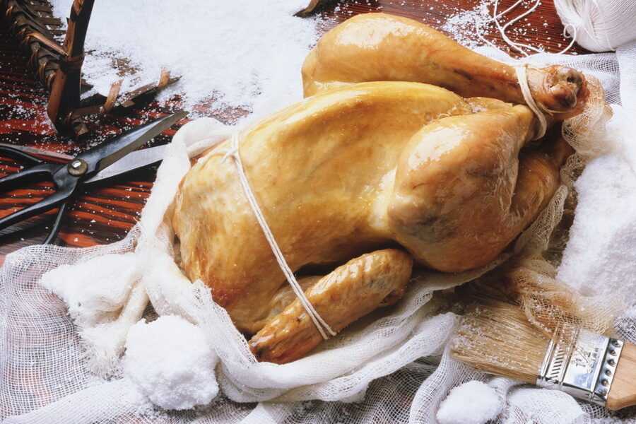 - Тушку нужно правильно выбрать и разморозить, если вам пришлось приобрести замороженный продукт. Птица должны быть свежей, без неприятного запаха и пятен на коже, упругой. Если она заморожена, позвольте ей оттаять постепенно в холодильнике. Резкая дефростация приводит к большой потере влаги, что негативно сказывается на органолептических качествах мяса птицы.