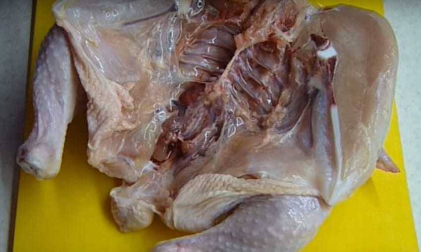 2. Тушку тщательно промойте. Чтобы мясо быстрее и равномернее пропеклось разрежьте курицу по грудке. Или можете порезать ее на порционные кусочки.