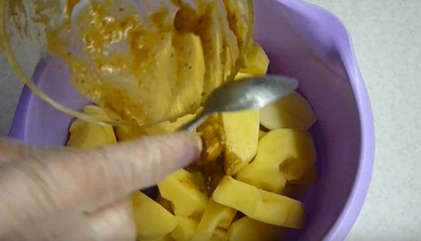 Картошку хорошенько перемешиваем руками, чтобы все приправы равномерно распределились.