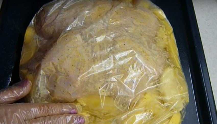 7. Следом отправьте курицу, обложите ее остатками гарнира. Рукав завяжите, равномерно распределите содержимое и проткните зубочисткой или вилкой в нескольких местах.