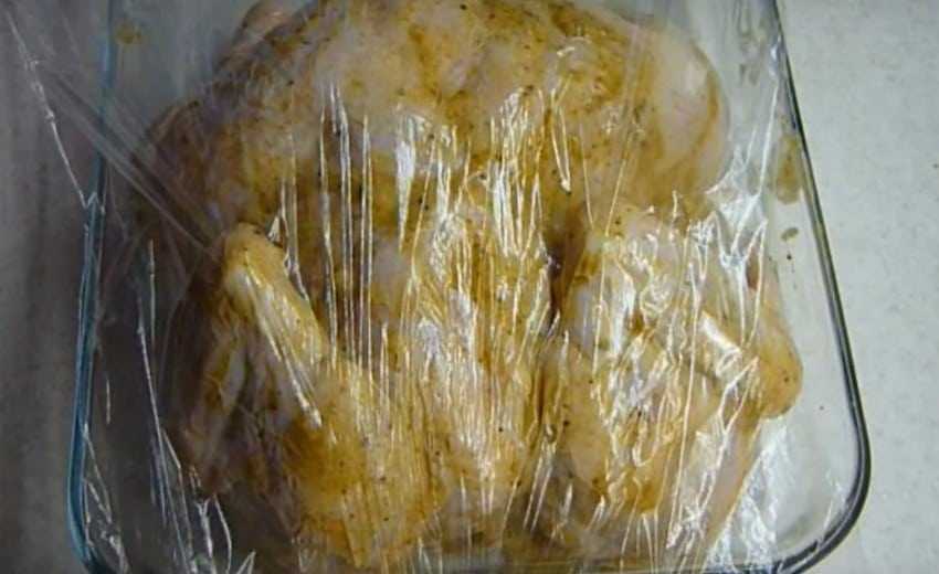 4. Курицу поместите в емкость, накройте ее пищевой пленкой и поставьте мариноваться в прохладное место на 1 — 2 часа.
