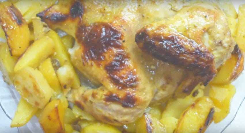 Я отправила блюдо на 1 час в разогретую до 200 градусов духовку, если запекаете курицу, то времени нужно минут 40. Мясо можно проверить, чтобы оно внутри не было сырым, и картошку проткнуть вилкой или ножом.