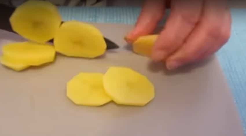 3. Сделать в каждой картофелине поперечные надрезы на расстоянии 3-4 мм, но не прорезать клубни насквозь, оставив 5-6 мм.