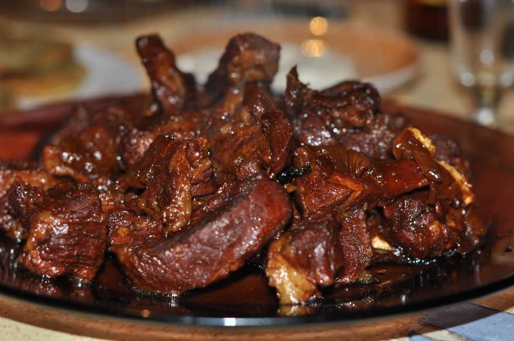 Обычно говядину тушат некоторое время, чтобы кусочки получились мягкими и нежными. Для следующего рецепта берем 600 грамм мяса, три ложки масла сливочного, две ложки пюре из помидоров, головку лука, корень моркови и петрушки, две больших ложки сахара, ложку винного уксуса, лист лавровый, кориандр, перец и 60 грамм ржаного или бородинского хлеба. Начинаем с нарезки мяса. Режем поперек волокон, предварительно отбив его.