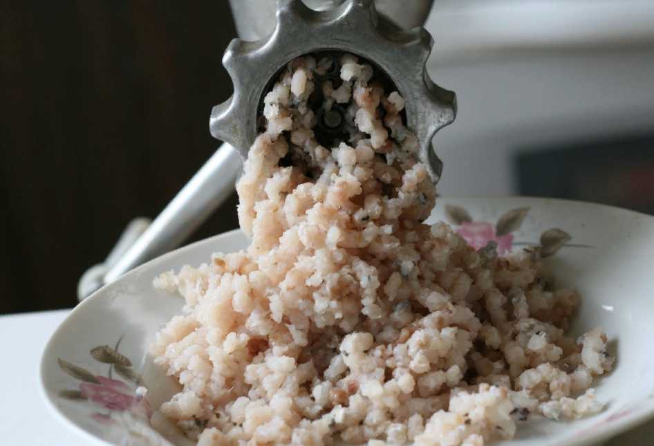 - Свинину и курицу перемалывают в фарш на мясорубке.