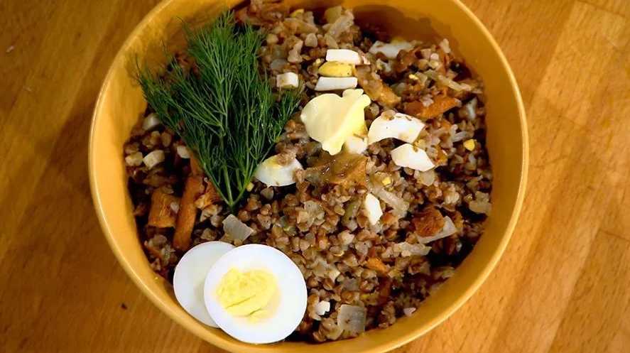 - Когда гречка свариться выкладываем порцию на тарелку, смазываем кусочком сливочного масла. Сверху выкладываем грибы с луком и морковью и порезанные яйца. Любители остроты могут могут немного поперчить. Гречка с грибами готова! Сочетание гречки и грибов – очень удачное. Не пропустите! Приятного аппетита!