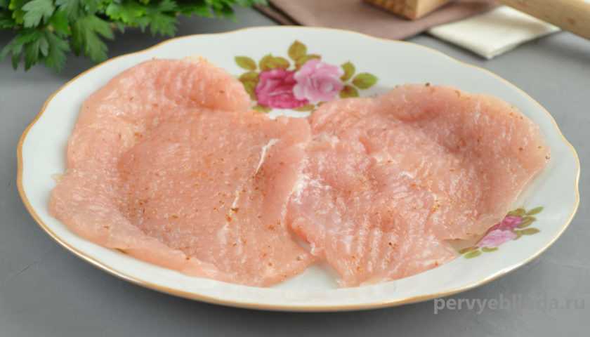 - Порезать мясо курицы тонкими пластинками. Слегка отбить кухонным молоточком. Немного посолить.