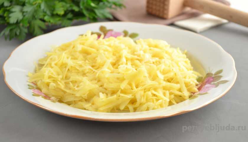 - Отварите картофель в мундирах 6-10 минут после закипания. Остудите, очистите и натрите его на тёрке.