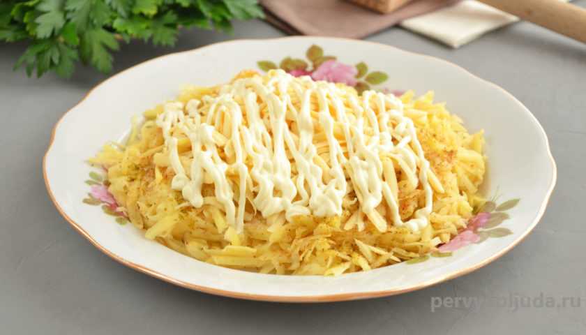 - Картофель очистите, помойте и натрите на терке. Аккуратно положите его на овощи и смажьте майонезом.
