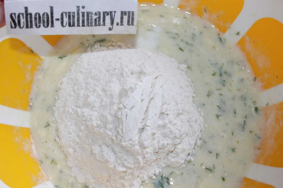 Кефир должен быть комнатной температуры, ни в коем случае не используйте холодный кисломолочный продукт. Наливаем кефир в глубокую миску. Вобьем яйца и добавим муку с солью. Перемешаем все ингредиенты венчиком. Тесто должно получиться однородным и очень густым. Если вы наберете тесто в ложку, оно будет тяжело с нее стекать