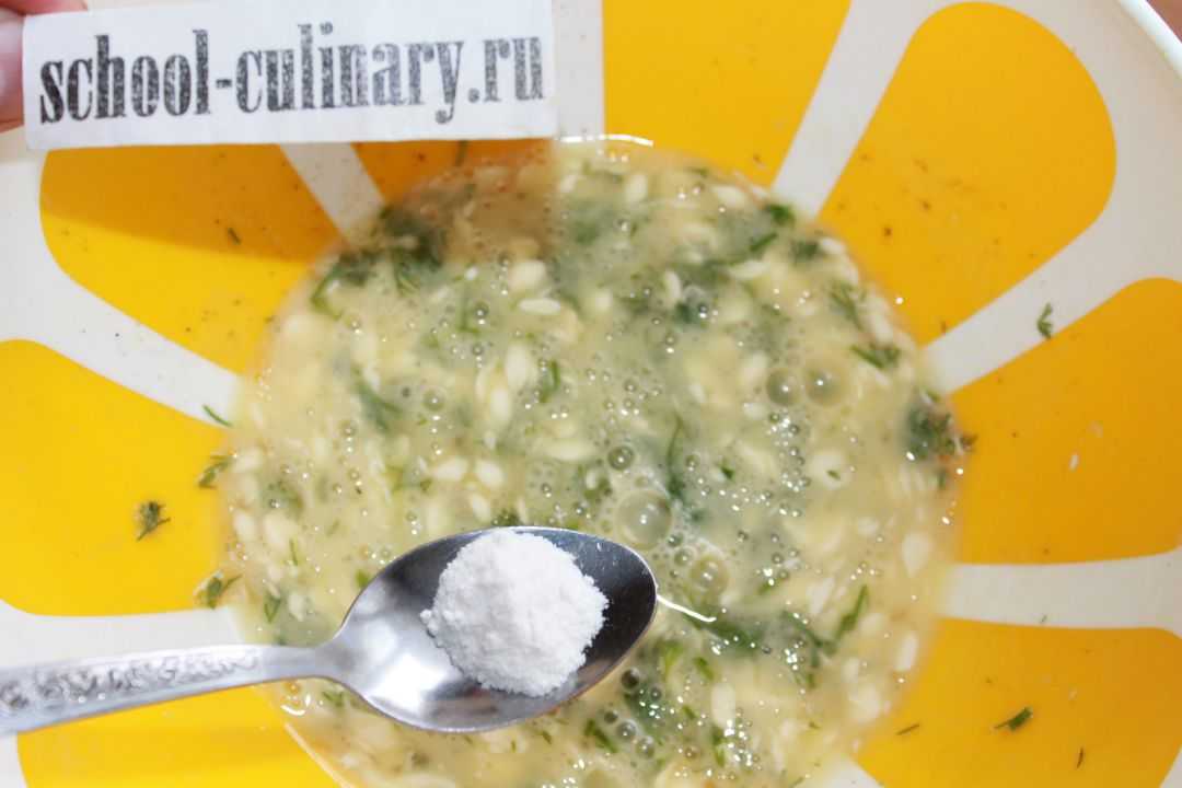 7. Через время добавляем к тесту соду, снова всё перемешиваем и отправляемся к плите. И да, следует знать, что сода отлично заменяется кондитерским разрыхлителем.