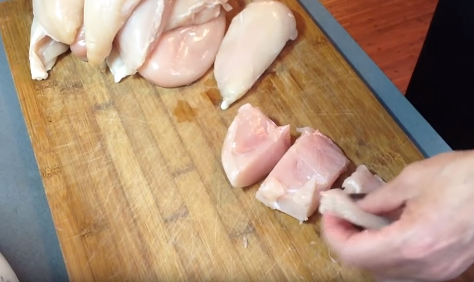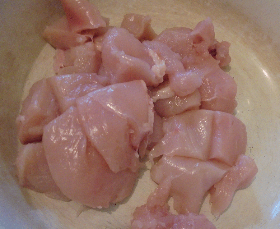 1. Филе курочки нарезаем на одинакового размера кусочки.