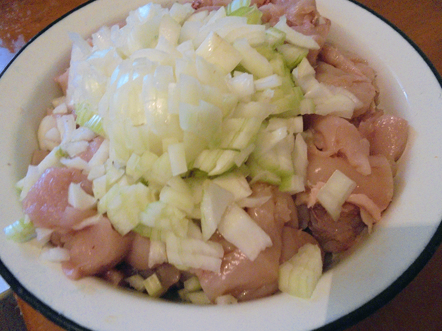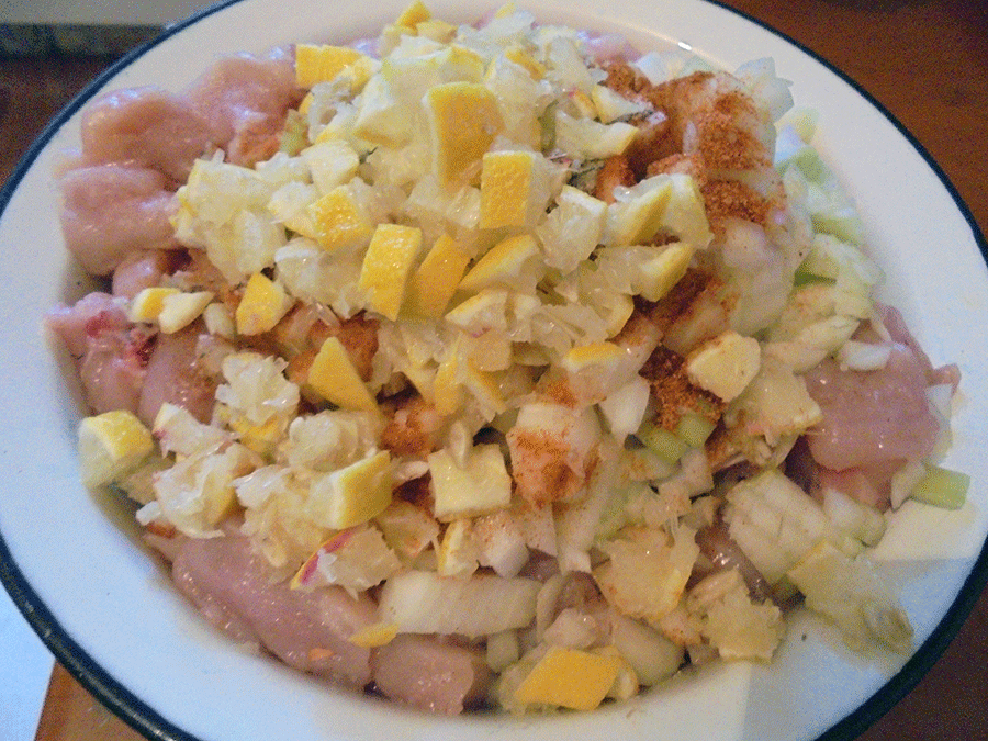 5. Лимон порежьте на маленькие кусочки, либо даже натрите на терке прямо с кожурой. Добавьте лук и лимон к курице. Добавьте чайную ложку соли, приправы по вкусу, четыре-пять столовых ложек растительного масла.