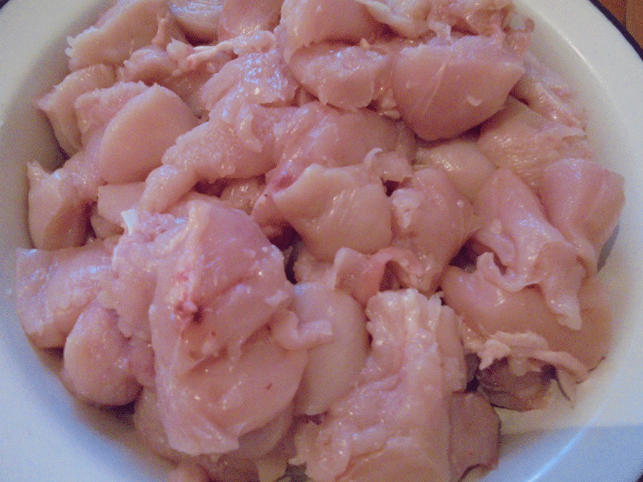 Филе конечно желательно брать охлажденное так как из замороженного мяса шашлык получится мягко говоря не особо вкусным. Так как заморозка убивает мясо. И так охлажденное филе нарезаем на куски не меньше 3-4 см. и складываем в общую миску. Не солим пока.