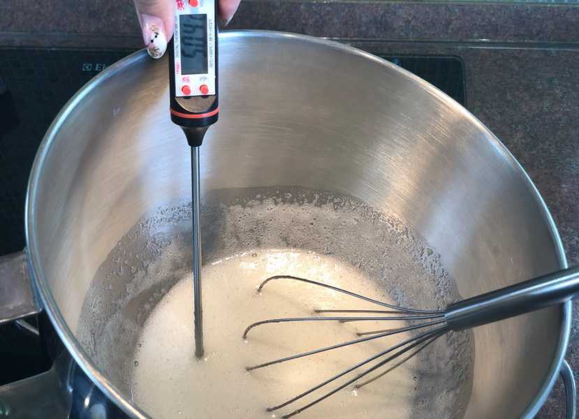 Важно постоянно помешивать нашу смесь, иначе белки начнут схватываться и завариваться. Нагреваем смесь до 50 градусов