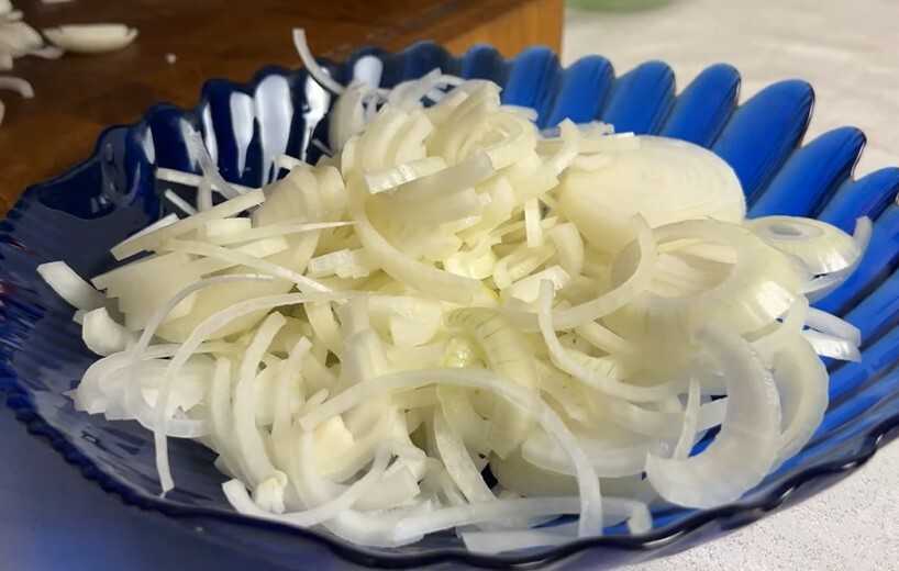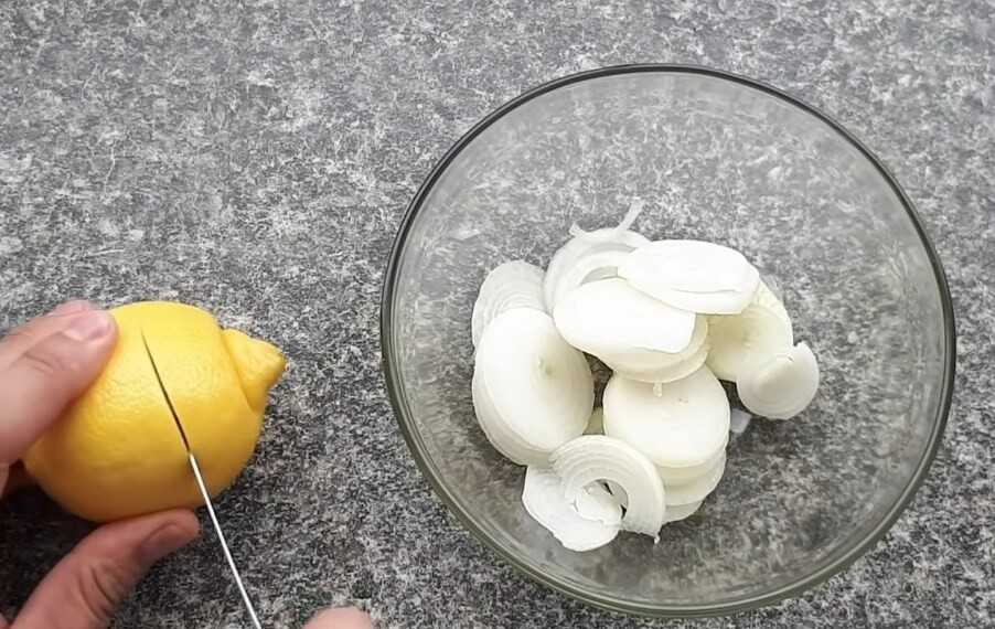 Рецепт. Лук очистите, сполосните. Нарежьте четвертинками колец. Заправьте горчицей и лимонным соком. Немного подавите смесь, чтобы лук стал мягче.