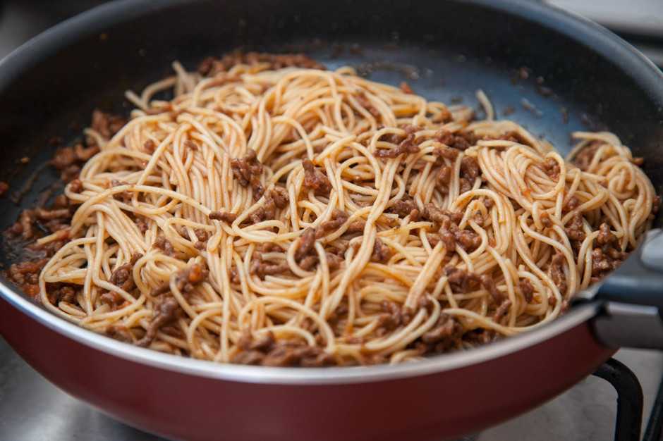 На сковороду к мясу добавьте остывшие спагетти, постоянно помешивая, подержите на медленном огне.